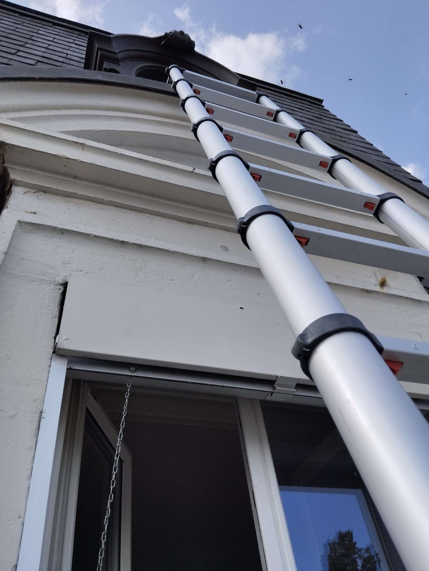 Unser Experte arbeitet in bis zu 10 Metern Höhe, um ein Lüftungsrohr von Wespen zu befreien. Je höher der Einsatzort, desto größer sind die Herausforderungen und Sicherheitsanforderungen. Um ein sicheres Arbeiten zu gewährleisten, nutzt er je nach Gegebenheit eine stabile Leiter oder ein zuverlässiges Gerüst.