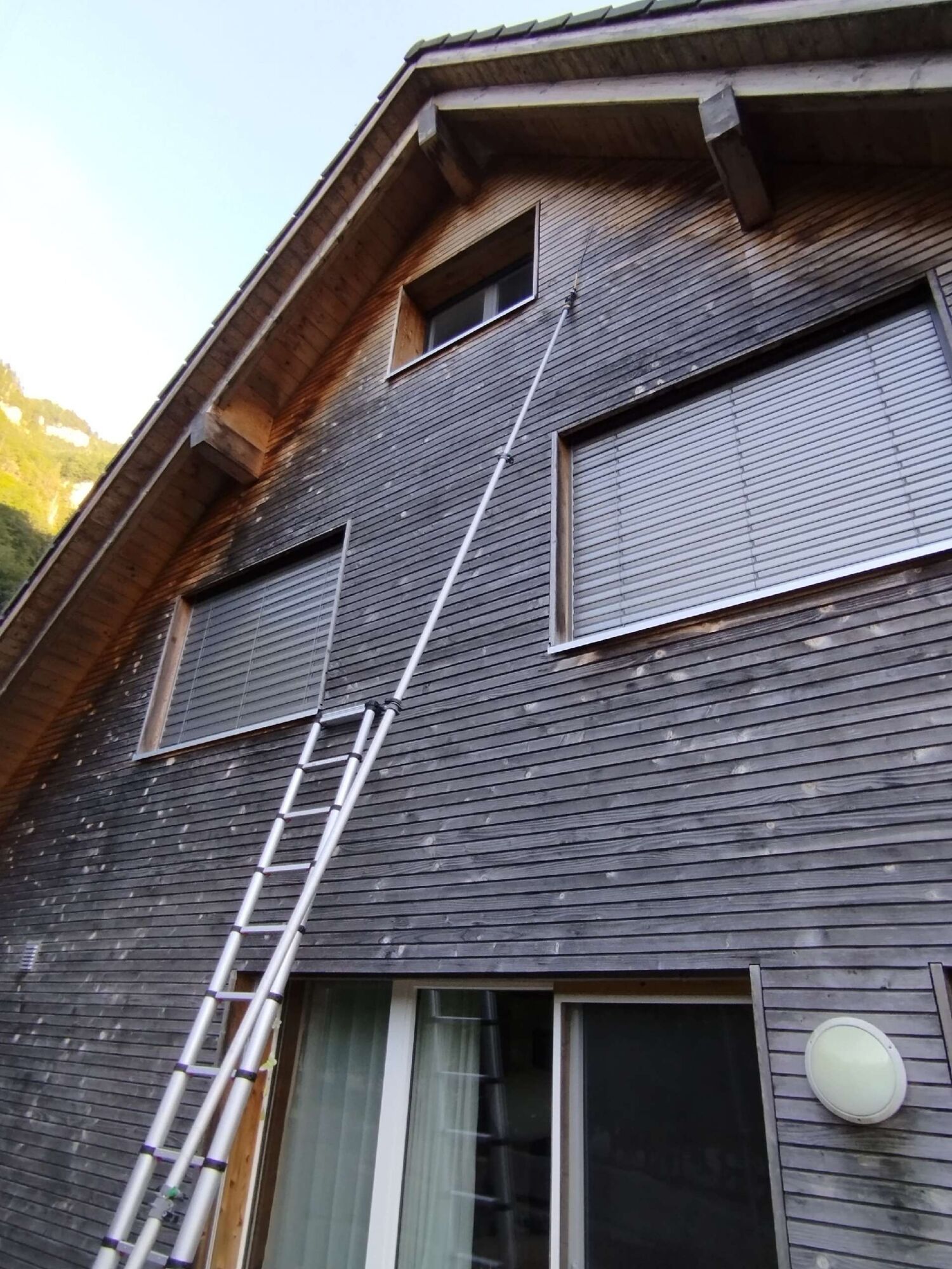 Unser Experte arbeitet in bis zu 10 Metern Höhe, um ein Lüftungsrohr von Wespen zu befreien. Je höher der Einsatzort, desto größer sind die Herausforderungen und Sicherheitsanforderungen. Um ein sicheres Arbeiten zu gewährleisten, nutzt er je nach Gegebenheit eine stabile Leiter oder ein zuverlässiges Gerüst.