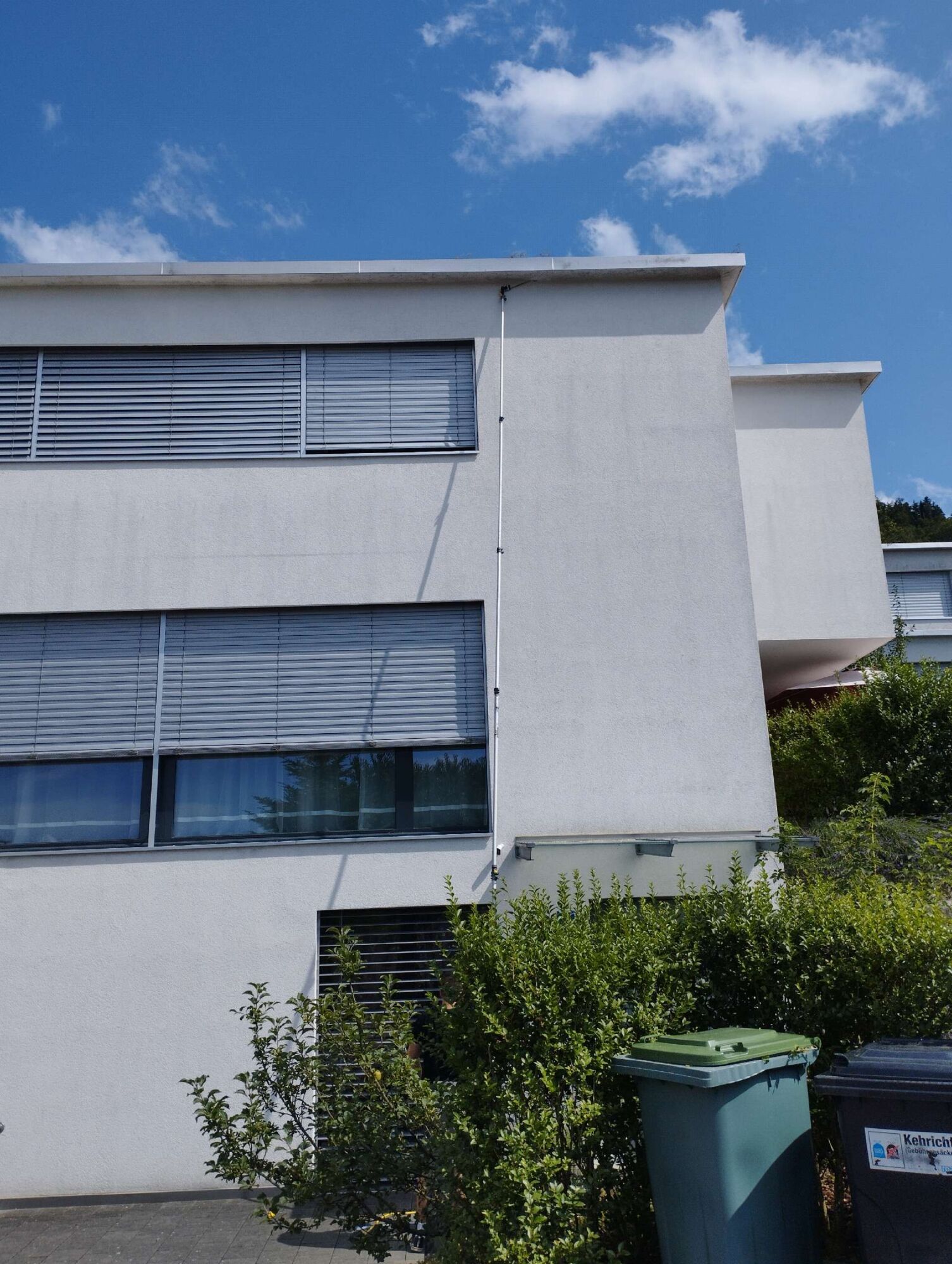 Unser Experte arbeitet in bis zu 10 Metern Höhe, um ein Lüftungsrohr von Wespen zu befreien. Je höher der Einsatzort, desto größer sind die Herausforderungen und Sicherheitsanforderungen. Um ein sicheres Arbeiten zu gewährleisten, nutzt er je nach Gegebenheit eine stabile Leiter oder ein zuverlässiges Gerüst.